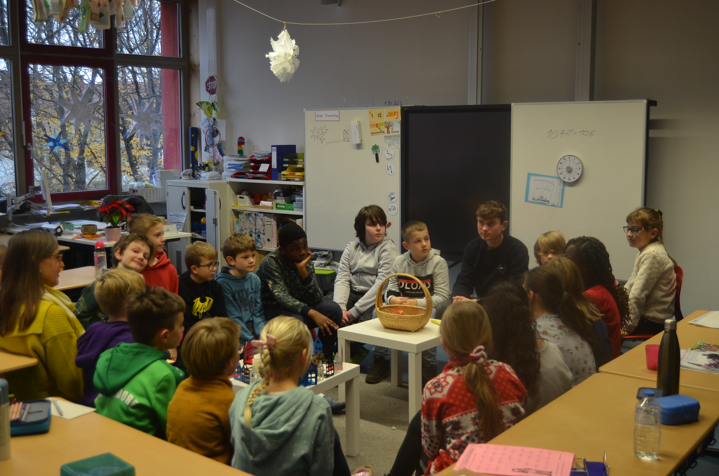 Begonnen hat der gemeinsame Tag bereits in der Unterrichtszeit. Die Betreuenden der SKB waren schon in der 3. und 4. Stunde gemeinsam mit den Lehrkräften im Unterricht. Sie haben hospitiert oder eine gemeinsame Aktion mit der Klassenlehrkraft durchgeführt. So haben an diesem Tag weihnachtliche Bastelaktionen, ein gemeinsames gesundes Frühstück sowie Haustürbesuche bei den Kindern im Stadtteil Mooswald und vieles mehr stattgefunden.